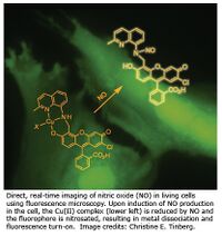 Related sensors are under construction for detection of biological nitric oxide. The focus is currently on the synthesis and characterization of transition metal complexes containing a fluorescent ligand that is released upon addition of NO and signals the presence of this neurotransmitter by light emission. Experiments are also being conducted with live brain slices to use zinc release to track neural network formation and communication. This work has led to the first molecules that detect NO in living cells by fluorescence, rather than one of its derivative reactive nitrogen species.