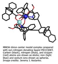 Both physical and mechanistic studies of soluble methane monooxygenase, toluene/o-xylene monooxygenase, and phenol hydroxylase are currently in progress to characterize the active site geometries and the catalytic mechanism of the hydroxylase components (MMOH, ToMOH, PHH) of these fascinating enzymes. Genetic studies of the native sMMO operon and of the ToMO and PH proteins expressed in E. coli, mechanistic investigations of the MMOH, ToMOH, and PHH catalytic reaction cycles, spectroscopic and X-ray crystallographic analyses of key intermediates in the reactions, and details of the hydrocarbon activation chemistry are in progress. Also being investigated are the structures and functions of the reductases, coupling, and other proteins in the sMMO, ToMO, and PH systems alone and in complexes with the other components. Solution NMR spectroscopy has been used to determine the structures of MMOB, the coupling protein, and the ferredoxin and flavin components of MMOR. The electron transfer reactions of MMOR are also being studied. Recently, expression in the native organism of a fourth protein in the sMMO operon has been demonstrated. The properties and function of this protein, MMOD, are under investigation. Additional proteins in the system have also been identified and are being characterized. Recent X-ray crystal structure determinations of ToMOH and PHH have revealed important features about substrate access to their catalytic diiron centers that guide site-directed mutagenesis work to probe features of their O2 activation and hydrocarbon oxidation chemistry.