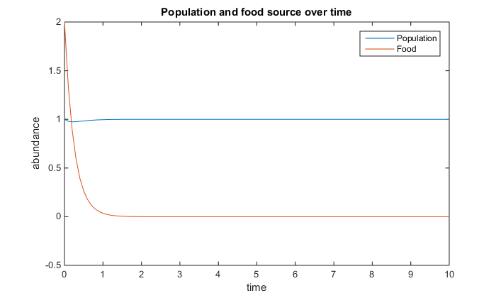 I fulfilled the purpose of this assignment, which was to create and manipulate three different models of population growth and nutrients. One of the main findings of today's project was that in each of the scenarios, the population size and the amount of food available leveled out to a consistent rate. This is because the chemostat adds nutrients continuously at a fixed flow rate and concentration. The flow out of the chemostat is also set at a fixed rate. The amount of food was never at zero because more food is always being brought in. With an unlimited amount of food, the population is free to grow as much as it wants. The population decreased for a period of time when a linear mortality term was added, but both the population and the amount of food leveled out as time went on. When a second nutrient was added, both nutrients decreased as the population increased and then leveled out.