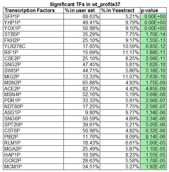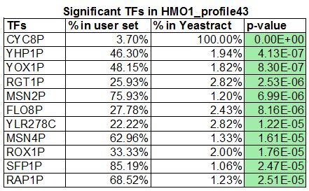 - List the "significant" transcription factors, along with the corresponding "% in user set", "% in YEASTRACT", and "p value".