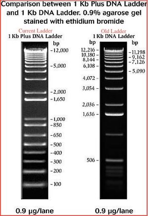 - (We used to use Invitrogen's 1Kb DNA Ladder, catalog# 15615-016, Media:Invitrogen_1KbLadderProductManual.pdf, Media:1kb Gel Ladder Map.jpg, but they have since discontinued this product. The two products are compatible.)