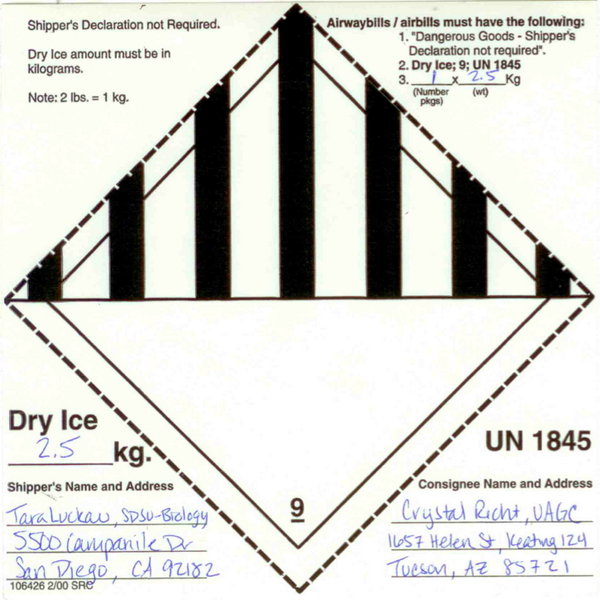 When shipping genomic DNA or PCR product, it is helpful (and possibly necessary) to keep the samples frozen. Dry ice (solid CO2) is the preferred cooling agent for mailing shipments.