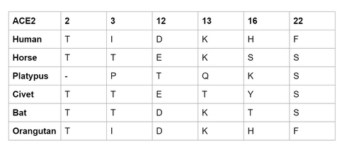 - The sequence of the ACE2 alpha-helix of the 19 species was recorded in the picture below.