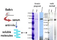 Deviations from the concentration of these molecules in the body fluids of healthy individuals, have been recorder in numerous pathological conditions, such as viral encephalitis, rheumatoid arthritis, pathologic pregnancies, asthma and AIDS. These results imply that soluble MHC molecules have a special role, in the pathology of these diseases but it is not clarified whether they contribute to the pathology or if they are by-products of the pathological condition (they could have a potential role in the diagnosis of the disease stage). Additional research has confirmed that soluble forms of MHC molecules can have various immunomodulating effects, such as induction of apoptosis of CD4+ activation of CD8+ T cells and down-regulation of NK activity. The aim of this study was to perform a downstream investigation of the possible immunomodulating action of soluble MHC molecules isolated from the serum of male and pregnant Balb/c mice. We selected the 12th day of gestation for the isolation of the serum, according to Ranella A. (The role and the regulatory mechanisms of growth factors, membrane and secreted MHC class II molecules in the survival of the hemiallogeneic embryo during gestation, Ph.D. thesis, University of Crete, unpublished data), because the titer of the serum reaches a maximum. During the study we used affinity chromatography and immunoprecipitation for the isolation of sMHC II from the serum and cell culture techniques, in order to reveal any effect on freshly isolated spleen cells. Pregnancy is often called immune paradox, because the immune system of the mother allows to the fetus to survive although it is an allotransplant. Generally, pregnancy is largely considered to be a TH2 phenomenon that is characterized by downregulation of the immune system in the point where the mothers body meets the fetus. Soluble MHC class II molecules secreted by trophoblast cells could contribute to the development of tolerance, because the ability of antigen presentation from the trophoblast is lost along with the secreted MHC II. However, it has not been determined whether the molecules we isolate from the serum originate from the trophoblast. The presence of the same molecules in the serum of male mice suggests an alternative source. Our results revealed the following information: