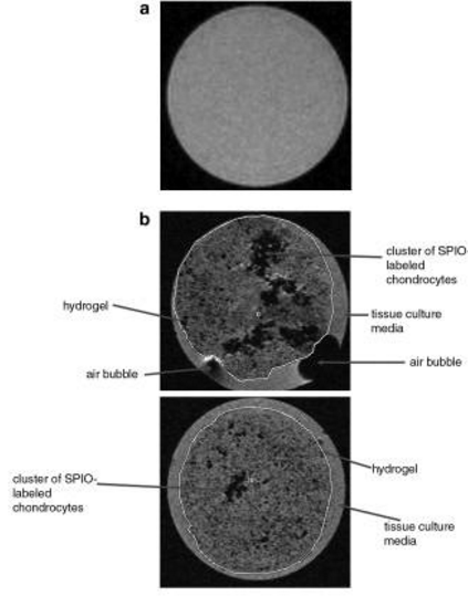 Repair and replacement of cartilage is a pressing issue in tissue engineering and Ramaswamy et al conducted an experiment SPION labeling chondrocytes in tissue engineered cartilage to test viability. Chondrocytes were removed from the patellar of newborn calves for the experiment. The cells were then labeled using Feridex IV and seeded into a hydrogel scaffold. Function of the chondrocytes saw minimal hinderance from the SPOIN and a neocartilage developed over 35 days. Figure 2 shows the comparison of unlabeled and labeled chondrocytes in the hydrogel after 30 days. By labeling the cells with superparamagnetic iron oxide nanoparticles, the tissue's structure and cellular health can be observed using MR imaging [11].