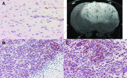 Many focuses of tissue engineering revolve around the basis on cell angiogenesis. Tissue engineered skin grafts are just one example where the success of the tissue is directly correlated to angiogenesis. Towner et al developed a novel idea of assessing cell angiogenesis by monitoring vascular endothelial growth factors (VEGF) with magentic resonance imaging. Magnetite nanoparticles were covalently bound to VEGF probes as a tracer for MR imaging. These probes are a microdevice that have similar characteristics to antibodies, attaching to VEGF but not affecting it. A culture of tumorous cells were placed into the brain of a rat for testing. The hypothesis was that a tumor would have higher levels of VEGF, attracting a large amount of tagged VEGF probes. Tumor growth in the brain tumor was able to be detected by MR imaging in combination with the nanoparticle tagged VEGF probes. Figure 5 shows the MR images of the tumor treated with the tagged VEGF probes. The experiment proved that angiogenesis can be tracked using magnetic resonance imaging in combination with VEGF probes. The rat tested experiment devevloped a new way of monitoring tumor growth as well as other engineered tissues reliant on cell angiogenesis [14].