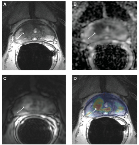 Prostate cancer detection has had huge advancements when coupled with magnetic resonance technology. The American Cancer Society has found that nearly 20% of men will be diagnosed with prostate cancer in their lifetime and early detection is paramount to decrease mortality rates. MR techniques of diffusion weighted and dynamic contrast-enhancement have been integrated into clinical use for their high contrast [8]. Figure 4 shows the effectiveness of MR imaging in locating malignant tumors in the prostate. Figure 4D shows a colored contrast of a prostate tumor in a 57 year old man using a volume transfer constant (Ktrans). The volume transfer constant shows how much volume is being transferred from the blood stream to the tissue [13]. Figures 4A-D show progress in which magnetic resonance imaging is making to better locate and image malignant tumors.