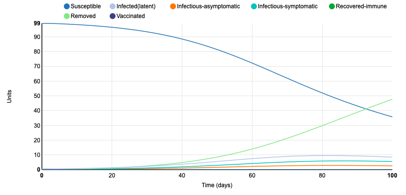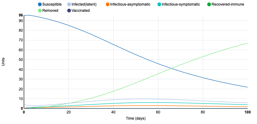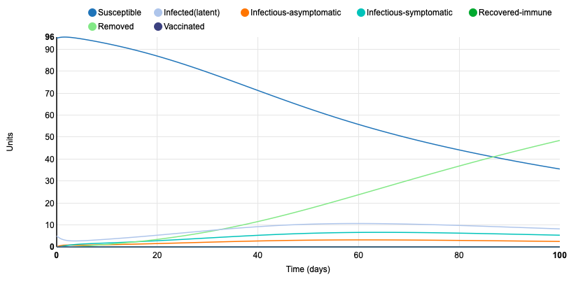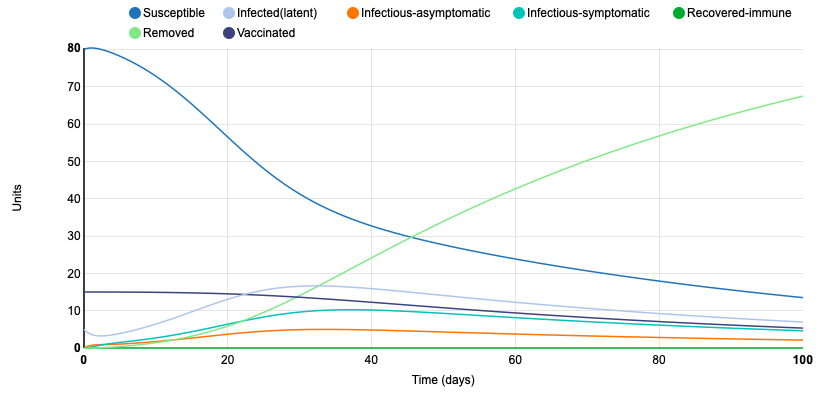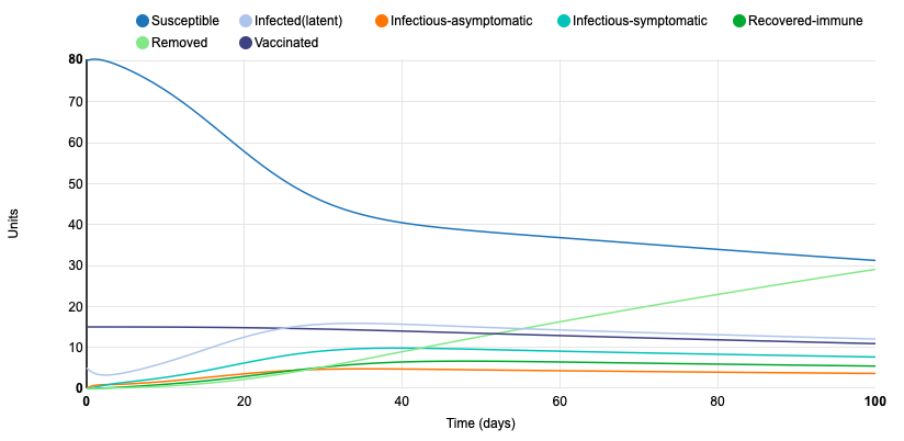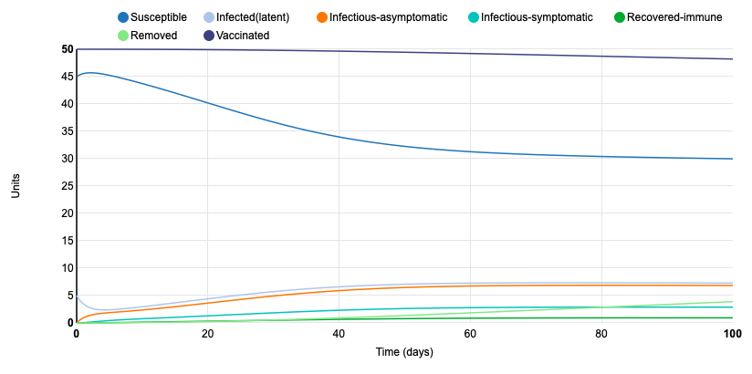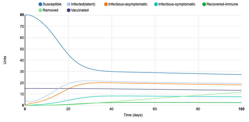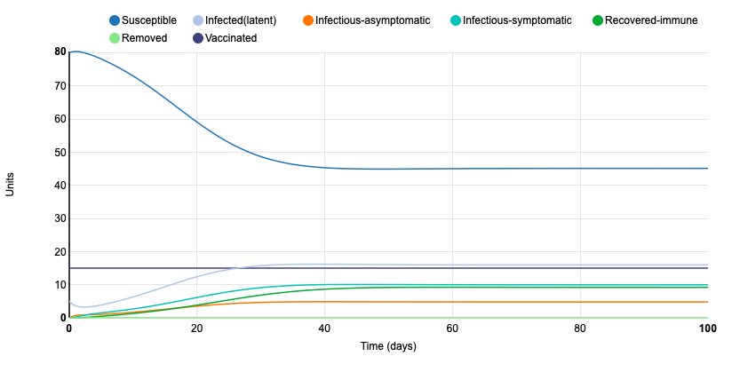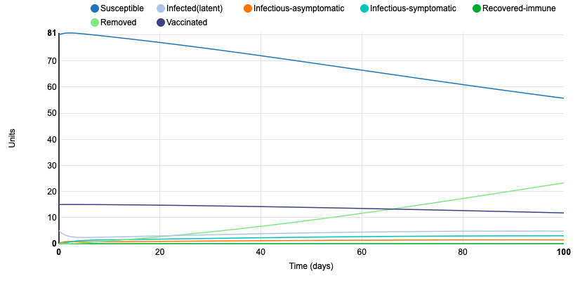 Next, I added in a control strategy -- vaccination. I set the proportion of vaccinated units to 0.15. This slowed the rate of infection by quite a bit. At day 100, 56 units were still susceptible and only 23 were removed. Throughout the simulation period, the amount of units accounted for in the infected (latent), infectious-asymptomatic, and infectious-symptomatic groups never totaled more than 10. Because a portion of the population was vaccinated, the probability of spreading the disease decreased.