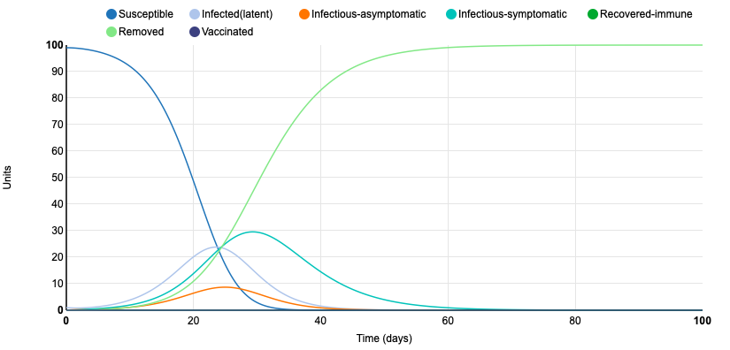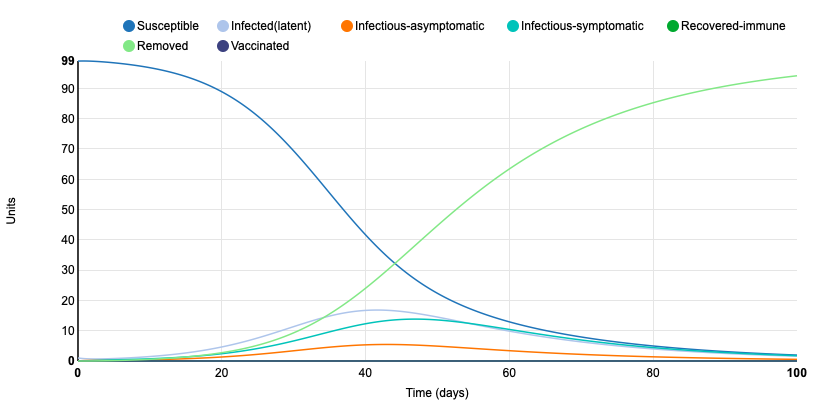 Next, I changed the duration of a unit in the population from 10 days to only 6 days. This extended the duration of the disease even more. After 100 days, only 47 units are removed and 36 are still susceptible.
