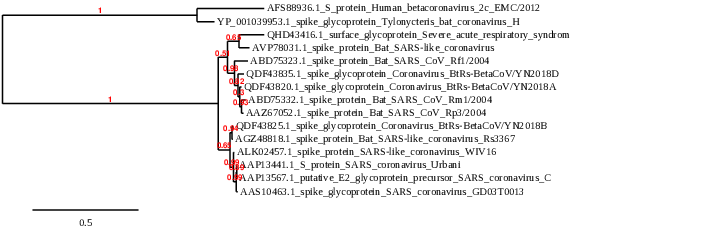 - The phylogenetic tree and the multiple sequence alignment show a lot of similarities. I first noticed that Human betacoronavirus (AFS88936) and Tyloncteris bat coronavirus (YP_001039953) are together in a clade separate from the rest of the sequences. When looking at the multiple sequence alignment, those two sequences are clearly very different from the rest of the sequences, and are fairly similar to one another. However, even though they make up their own clade, they do have a fair amount of differences in their sequences. This is also represented in the tree by the longer horizontal branch for Human betacoronavirus. The second major clade of the tree is broken into two subgroups. The sequence that I analyzed in Part 1 of the assignment (ALK02457) has three sister taxa shown in the tree. These three sequences are SARS coronavirus Urbani (AAP13441), SARS coronavirus CUHK-W1 (AAP13567), and SARS coronavirus (AAS10463). The alignment shows that the amino acid sequences for these four spike proteins are nearly identical.
