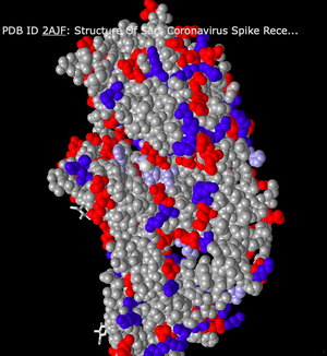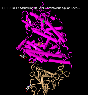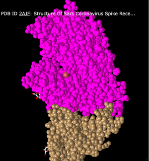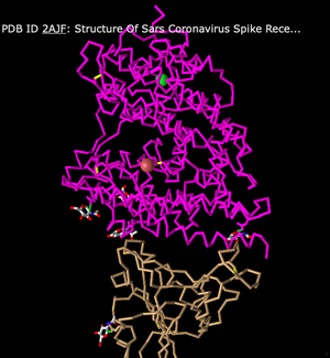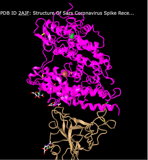 - The human ACE2 receptor has alpha-helix structures and the human SARS-CoV RBD has beta-sheets. This can be seen in the Ribbon style, where the top portion (ACE2) highlighted in pink is made up of coils and the bottom portion (SARS-CoV RBD) in the tan color has sheets.