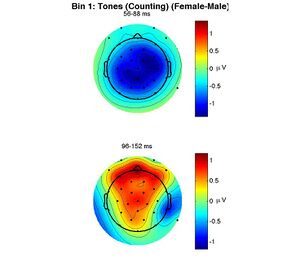 By looking at Bin 1, you can see the difference between men and women has two peaks: a negativity that peaks around 72 ms and positivity that peaks around 128 ms. By looking at Bin 2, the mean ERPs to tones from men and women, you can see a clear P1-N1-P2 series of auditory components.