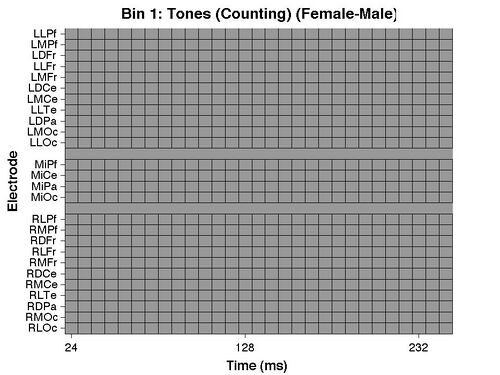 The following figures should be produced as well. The first is a raster diagram. White squares would indicate electrodes/time windows in which the ERPs to targets are significantly more positive, but there are no significant differences between women and men in this analysis either.