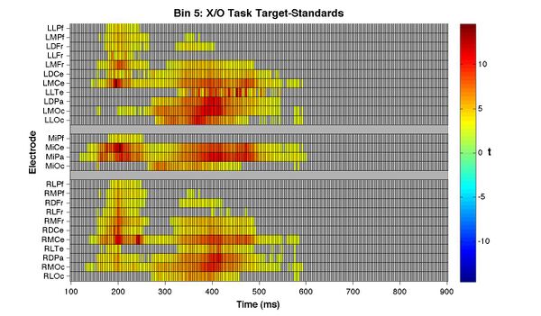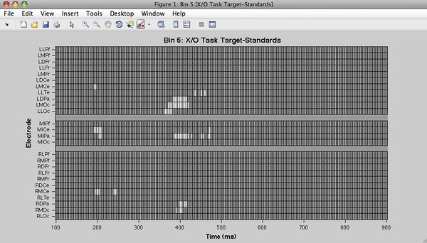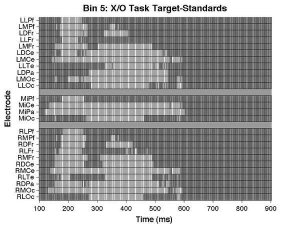 The following figures should be produced as well. The first is a raster diagram. White squares indicate electrodes/time windows in which the ERPs to targets are significantly more positive.