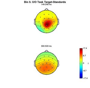 The other two figures produced are the topographies of the mean amplitude of the target-standard difference wave in the two time windows analyzed. In one figure the topographies are in units of microvolts, in the other, they are shown as t-scores. White circles indicate electrodes for which the ERPs to targets and standards are significantly different.
