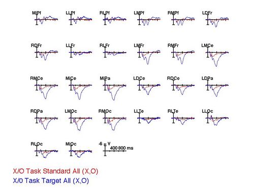 This shows us that the oddball P2 effect begins earlier in the XO oddball task (around 200 ms) and that there is what appears to be an N2 effect in the XO oddball task that isn't there in the letter case oddball task (around 300 ms).