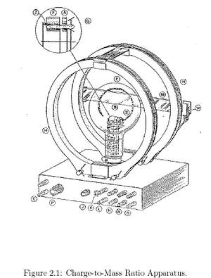 - This experiment is using the Helmholtz coils and a helium filled tube with an electron gun to measure the e/m ratio. That is the electron charge-to-mass ratio. A heating element inside the tube is heated to the point where electrons in the metal are 'boiled' off and with the help of a voltage applied between two plates the electrons are accelerated. The helmholtz coils are supplied with a current to generate a magnetic field that according to the Lorentz force law will cause the electrons path to be bent into a circular trajectory inside of the tube. As the electrons move through the tube they collide with helium atoms that become excited by the collision and then radiate, allowing us the see the path that the electrons are taking. Measuring the radius of the electrons circular path allows for the calculation of the Charge-to-Mass ratio.