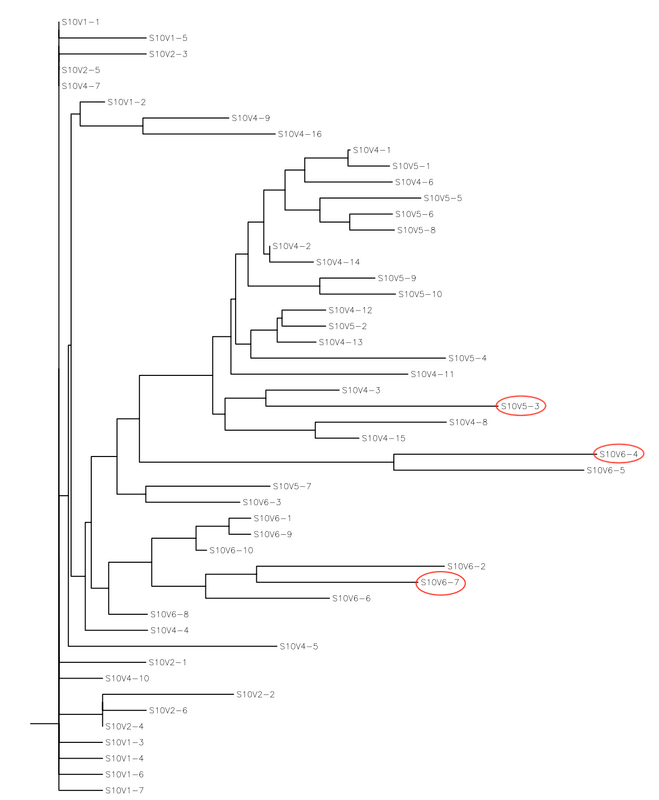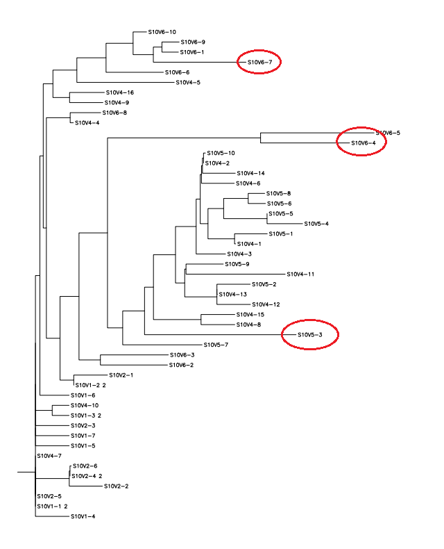 - Using the data obtained from our methods, S10V6-4, S10V5-3, and S10V6-7 had the highest diversity compared to the original strain. Given that these clones are from the last visit, it numerically shows how much the amino acid sequences changed from the first visit to the last visit. In our next step, that has not been completed yet, we will look at which specific amino acid sequences were changed. This will give us an idea if there are certain amino acids that are more important in the physiological output of the change than others are.