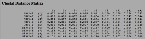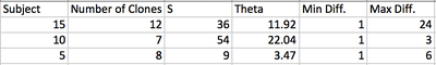 Subjects 15, 14, and 12 seemed to be the most related, as they were the closest together on the unrooted tree created in the ClustalW sequence alignment. Subject 13 was definitely the outlier of the group. The clones of each subject were clustered together. This makes sense as they are just different sequences from the same subject. However, it does show that there is a difference between each sequence. In regards to a comparison within the subjects themselves, subject 10 had the closest related clones. However, this subject did have the least clones of the subjects tested. While running a comparison between two subjects, it was found that 4 and 9 were the most closely related out of the others tested. In conclusion, this project allowed us to practice looked at how related sequences are through min and max differences, unrooted trees, and S values.