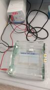 - Place your gel in the electrophoresis container and ensure that the TAE solution is filled to the marked line. If not, find TAE solution in the stock room and dilute it to 1x solution and fill the container.
