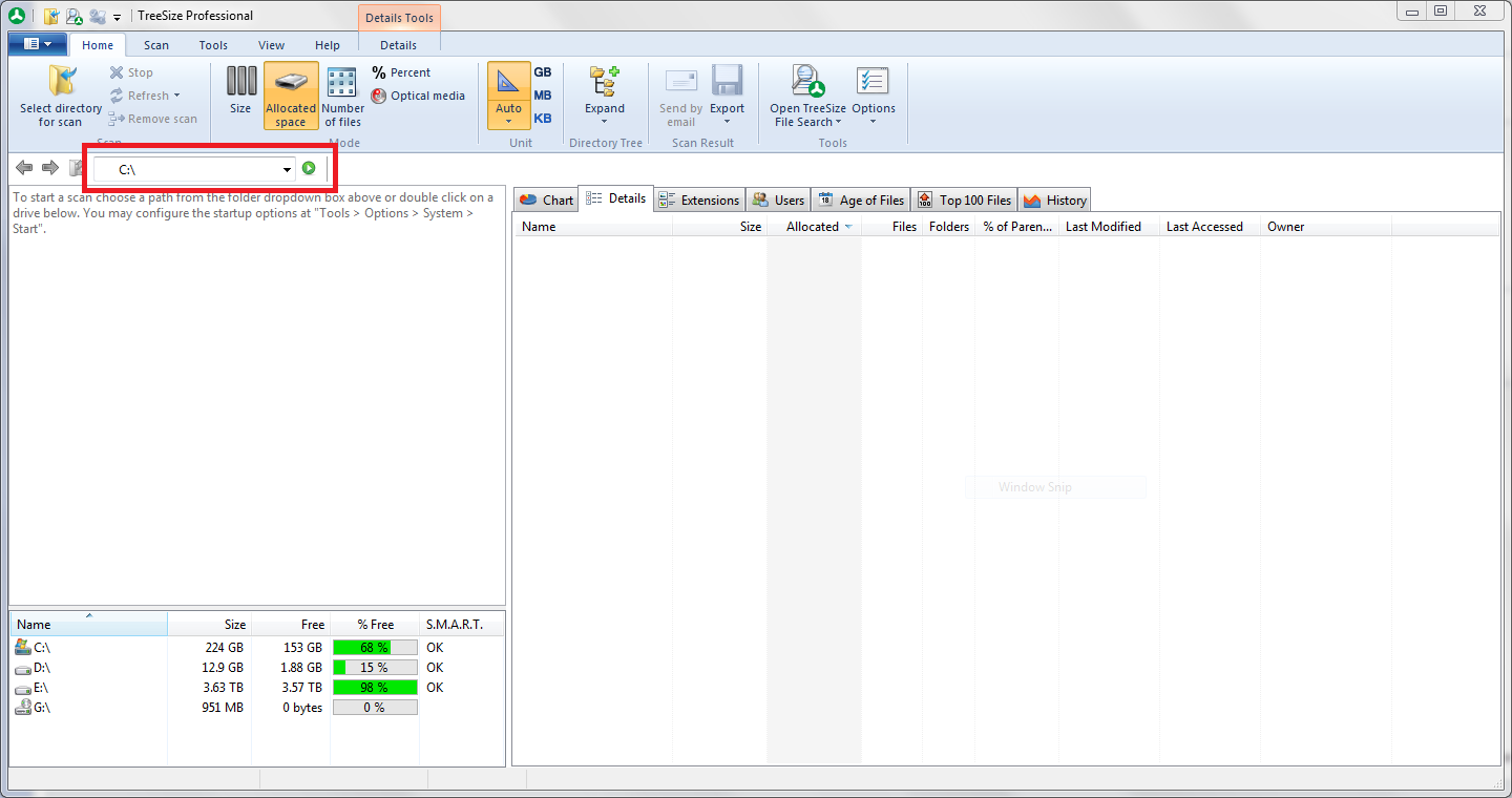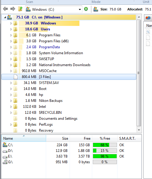 - TreeSize will scan the C: drive and list the directories in order of size.