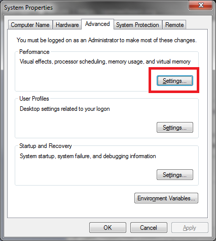 - Click the 'Advanced' tab, then under performance click 'Settings'