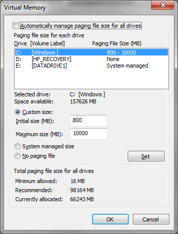 IT IS RECOMMENDED TO KEEP A SMALLER PAGEFILE (AT LEAST 800 MB) ON THE C: DRIVE.