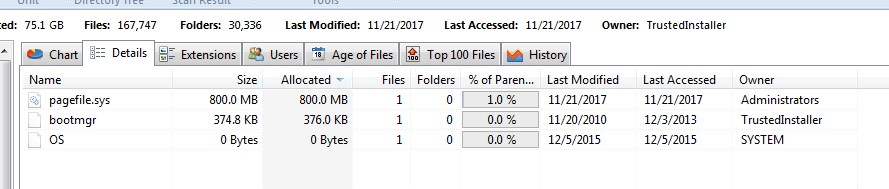 Now when you run TreeSize, you should see a much smaller pagefile.sys file on the C: drive and a large pagefile.sys file on your other drive