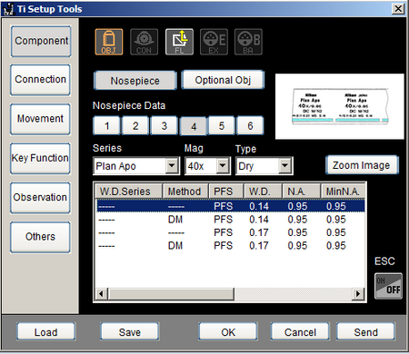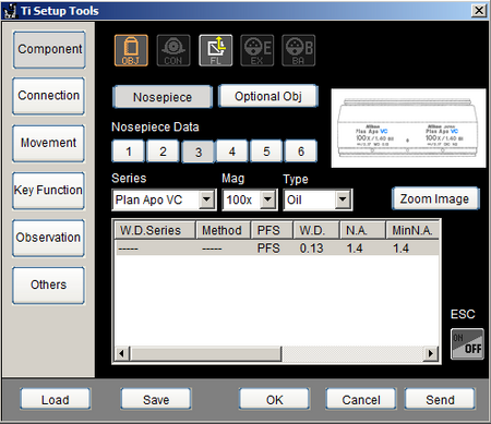 To use the PFS (perfect focus system) motorized nosepiece the objective information needs to be correctly registered on the microscope. Currently the objectives that we use most often (100x Plan Apo VC oil; 40x Plan Apo dry) are correctly registered. The 40x is registered to position 4 (and 1) and the 100x is registered to position 3 (and 2,5,6).