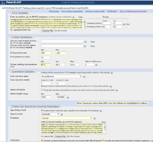 - Step 5- Fill in the "Primer Pair Specificity Checking Parameters." These parameters let it know which primers would bind elsewhere (off-target binding) so that those primers are not chosen. So it needs to know what other DNA will be in the mixture when the PCR is performed.