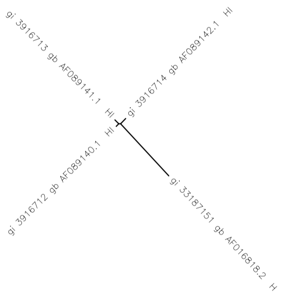 The tree created shows that three of the four sequences are very closely related as seen by the proximity to each other, while the fourth is quite different as seen by how far away it is. The three that are closest in relation are in fact from the same subject but different visits (subject 3). However, the non-similar one is from subject 2 on their 4th visit. Also, gi 3916713 and gi 3916712 are both from the same subject and the same visit (visit 5) and may be the two that are the most similar, although it is difficult to tell from the tree. This fulfilled the purpose because by learning how to create this tree and see how each sequence is connected we were able to study some aspects of sequence evolution.