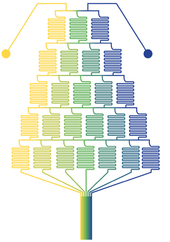 A gradient tree is a hierarchical microfluidic structure that can create highly complex and precise concentration gradients. The gradient resulting from a gradient tree is dependent on channel length, total contact area, and the number of contact areas.[5] In Figure 2, the gradient tree features a multitude of winding channels to facilitate mixing in a compact area via simple diffusion. Figure 2 represents a gradient tree which results in 7 linear dilutions based on 2 input streams. The leftmost outlet is a pure stream of the left inlet fluid. The rightmost outlet is a pure stream of the right inlet fluid. The center most outlet is an equal mixture of the right and left inlet fluids. Linearly formed concentration steps are formed in between. Each additional branch or layer added to the gradient tree introduces a new, step-wise change in the concentration between the two lines which come into contact in the horizontal "contact zone" channels. Linearity between each step can be maintained in this device by preserving equal volumetric flow rates between the two inlets.