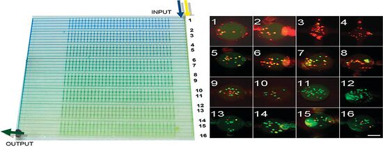 The geometry of a device can impact the concentration gradient a device produces. Asymmetry in a device can create a nonlinear gradient. In a device created by Selemovic et al. a grid of microfluidic channels are arranged in an asymmetric geometry with a coflow channel as an inlet at one end of the chip (Figure 3). The asymmetrical grid in their design allows for the partial mixing at each intersection to occur nonlinearly across the grid. Selemovic et al. were also able to change the type of concentration gradient based on the inlet flow rate. When using a relatively low flow rate an exponential concentration gradient was achieved and using high flow rates a sigmoidal concentration gradient would form.[4]