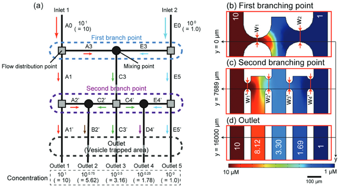 In a study by Abe et al., a microfluidic device resembling a tree like structure was created to produce a nonlinear, logarithmic concentration gradient. In their device the channels were divided at every branch with mixing points along each branch as depicted in Figure 4. The horizontal channels in between each of the mixing and dividing points were varied. Abe et al. found that by varying the horizontal channel width they were able to shorten their overall channel lengths to 1/7th of that of a standard nonlinear concentration device.[2]