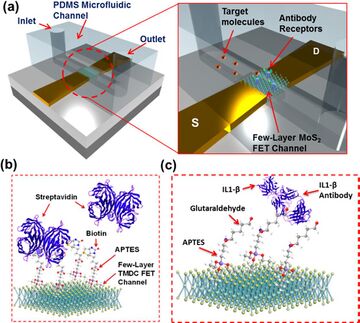 Figure 3 illustrates the MoS2-based field effect transistor (FET) biosensor, which is integrated with a polydimethylsiloxane (PDMS)-based microfluidic channel to quantification the different kinds of biomolecules such as fM-level biomarkers (different molecules can be testd with the change of detection receptors) in input solution. In the device, MoS2 acts as local gate of the FET. When the concentration of target molecules change, the induced electromotive force from molecules to MoS2 also change, which alter the local gate voltage, thus the concentration change of molecules can lead to the shift of the transistor I-V curve. The combination of MoS2 and microfluidic channels solves the challenges associated with the poor compatibility between electronic structure and liquid analytes in traditional sensors and provides rapid, low-noise, high specific biomolecule quantification at femtomolar levels.