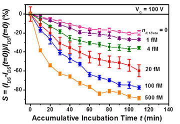 The running processes of the device can be divide into four steps as figure 4 shows: incubation, flushing, drying, and electrical measurement. The target molecules solution is infused into the channel and bind with the receptors in the incubation stage, DI water flushing is followed to remove the molecules not bind with receptors in the previous stage. Drying by dry air is the third step to remove water, thus the ion screening which forms at the interface between fluid and nanomaterials can be avoided. Electrical measurement is the last step to measure the I-V curve of the FET. After running multiple cycles of the whole 4 steps continually, the relationship between the response signal and time can be built and the concentration of molecules can be derived based on the difference of current drop rate of various concentrations.(figure 5) The multiple cycles test is able to avoid the influence of electrochemical damage caused by liquid-solution, nonspecific adsorption of molecules to the sensor and ion screening, which enhance the sensitivity, specificity, signal-to-noise ratio (SNR) and durability of the device.3