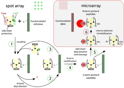 - Definitive establishment of peptide arrays came along with the development of the SPOT synthesis by Roland Frank [Frank, 1992; Frank, 2002] which simplified chemical synthesis of peptide arrays to the addressable deposition of reagents on a cellulose sheet.