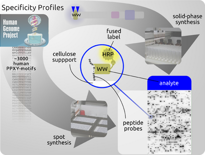 The objectives of our research principally spread around three main topics: profiling the binding specificity of protein recognition modules, analyzing the diagnostic potential peptide-based analyte capture assays, and exploring the potential of peptide/peptoide probes to define or modulate specific therapeutic strategies.