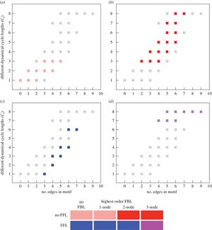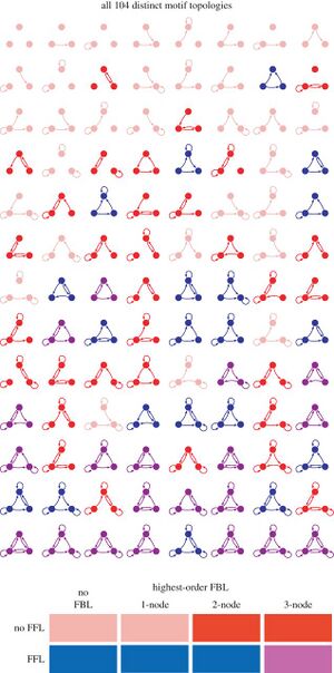 - All possible network motifs for a 3-node motif produced 512 possible ways of connecting the nodes. Using dynamical transition graphs and feed-forward loop motifs, this was narrowed down to 5 dynamical graph topologies