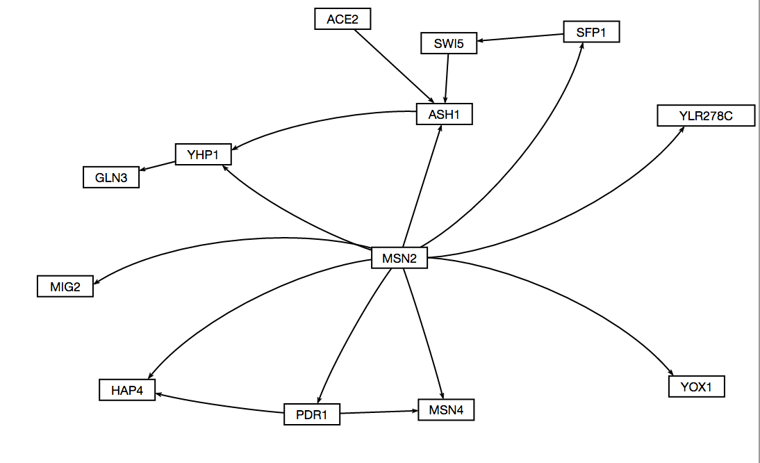 - Ran file through GRNsight to determine which we connected to other genes. Eliminated NDT80 because it was connected to nothing. Ran file through Gephi using this protocol (insert Gephi protocol here). Deleted transcription factors that had an in degree of 0 according to Gephi, because in previous research it was found those nodes not regulated by anything performed more poorly in the model. End network has 14 nodes, 17 edges
