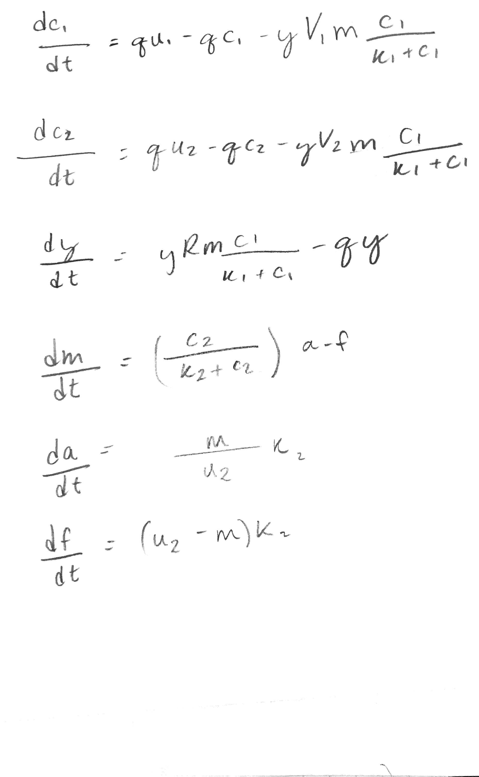 As said previously, my model is my best attempt at writing out a system of equations. What I found in last week's assignment was that the model was fairly good at modeling the multiplicative nutrient use requirement, the major hang up on the model was that the fermentation vs. respiration aspect was not well modeled. So this week in reading the papers, I found that the conversion rate of glucose into yeast biomass was where the metabolism term could be best fit, so I substituted c2/(K2+c2) for the state variable m. dm/dt was then defined by the conversion rate, times aerobic respiration minus fermentation to show that there was a shift between rates of aerobic respiration and fermentation. Since I found in the papers that aerobic respiration likely increases as glucose concentration decreases, I had (m/u2)K represent the rate of aerobic respiration. Similarly, ina paper I found that when u2 is high, K is also high so I set the fermentation rate to be (u2-m)K