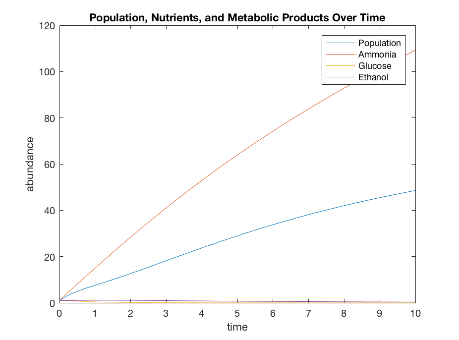 - Based on Dr. Fitzpatrick's notes and looking at the equations again I decided to remove the glucose consumption variable from my system of equations as it is redundant given the last term in the dc2/dt equation.