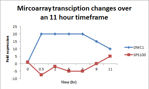 - (Question 5, p. 110) Choose two genes from Figure 4.6b (PDF of figures on Brightspace) and draw a graph to represent the change in transcription over time. You can either create your plot in Excel and put the image up on your wiki page or you can do it by hand and upload a picture or scan.
