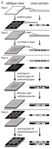The first multilayer paperfluidic device was fabricated by adhering each layer to the next with double-sided tape, shown in Figure 1.[1] The double-sided tape used is water impermeable, allowing for the separation of channels between each layer of paper. To allow for vertical flow in such a device, holes can be cut into the tape to connect the channels of each layer. To complete the connection between the two layers, cellulose powder can be filled in before adhering the top layer. This method proved to some to be too imprecise, as the assembly of the device requires both precision cutting and layering.