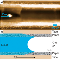 Expanding to a 3D structure allows for more complex device designs, which allow their capabilities to be expanded. Detection of multiple compounds requires more space on the device itself. The addition of vertical flow is able to reduce the size of such devices, and thus improve their accessibility.[4] Paper microfluidic devices also have a relatively low flow rate, as they depend upon capillary action for fluid flow. A device made with wax patterning found that by introducing gaps between paper channels in a 3D device, flow rates were able to drastically increase, as shown in Figure 3. The 3D geometry allows for the flow of the liquid in the gap between two paperfluidic layers to dominate the driving force of flow through the paper, as opposed to the lesser capillary driving force.[6]