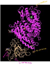 - Figure 11: 3d image of SARS-CoV RBD (the year 2002) complexed with Human ACE-2 (2AJF) with the N-terminus and c-terminus highlighted.