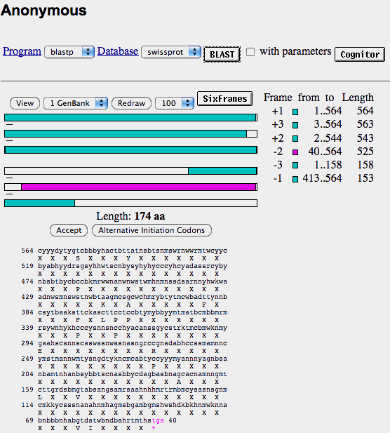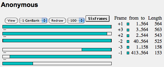 - When you click on on of the colored rectangles on the right-hand side of the screen, the program gives you the predicted amino-acid sequence as well as access to other databases that may have similar sequences to the one that ORF gives you.