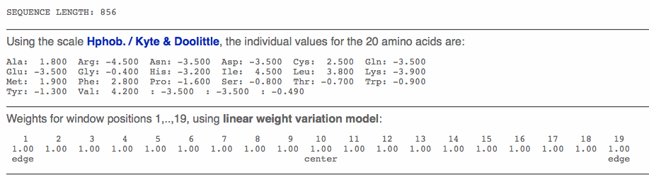 - Below is the results page that shows the Kyte and Doolittle Hydrophobicity Scale.