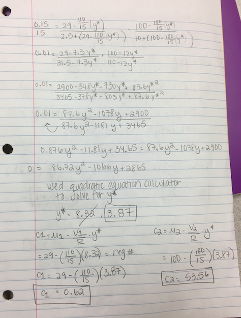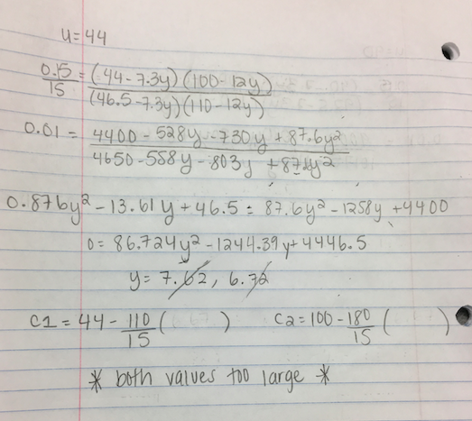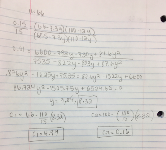 - plugged in both values of y into the equations for c1 and c2 to see which value gave positive values for c1 and c2