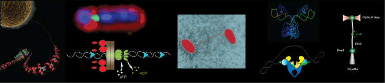 We are currently investigating DNA transport in two model systems: chromosome segregation by FtsK during cell division in Escherichia coli and by SpoIIIE during sporulation in Bacillus subtilis. Despite being mechanistically similar, these two DNA transport systems have been adapted for different biological processes (chromosome dimer resolution and sporulation) and will probably display different sets of genetic interactions. To tackle these problems, we are developing and using state-of-the-art single-molecule and microscopy techniques in vitro, to benefit from the unique detailed mechanistic insights obtained with reconstituted systems, and in vivo to fit our findings into the larger picture and find interaction partners that might be implicated in the process of DNA transfer. Our integrative approach involves the use of single-molecule manipulation (magnetic and optical tweezers) and imaging methods, such as Atomic Force Microscopy (with P-E Milhet) or super-resolution microscopy (with E Margeat), genetic and cell biology methodologies. We work closely together with French and International collaborators including Francois Cornet (CNRS-Toulouse, http://www-lmgm.biotoul.fr/equipes/grpcornet), Kit Pogliano (UCSD, http://www.biology.ucsd.edu/labs/pogliano/) and Carlos Bustamante (UC Berkeley, http://alice.berkeley.edu/).